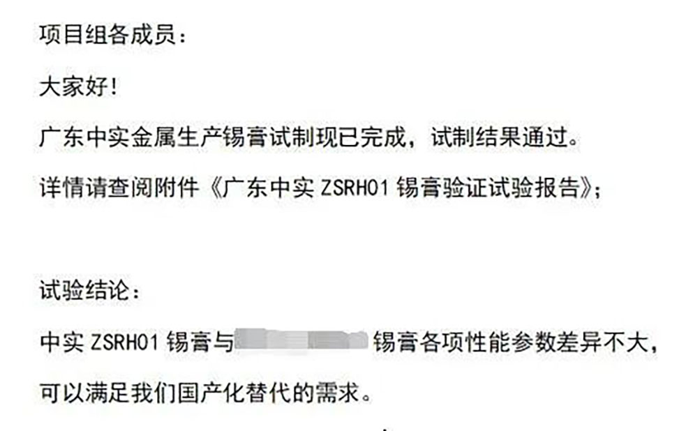近日,收到消息,经过半年多(duō)的对比试验论证,中(zhōng)实锡膏表现优异,从多(duō)家待选國(guó)内厂商(shāng)中(zhōng)脱颖而出,圆满通过验证环节,可(kě)用(yòng)于替代客户使用(yòng)的國(guó)际大牌锡膏,满足了客户國(guó)产(chǎn)化替代的需求。